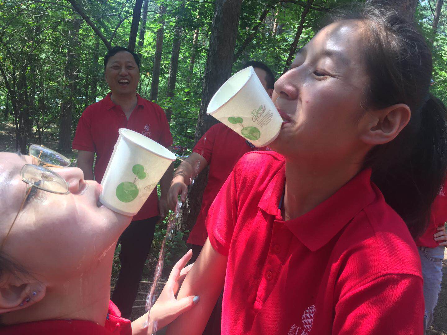 衔纸杯接水游戏,由第一名队员口衔的纸杯装等量水后,将杯中水倒入第二名队员的纸杯中,依次传递下去。在游戏过程中,不小心洒出来的水,为我们这个夏天带来了不一样的清凉舒爽。