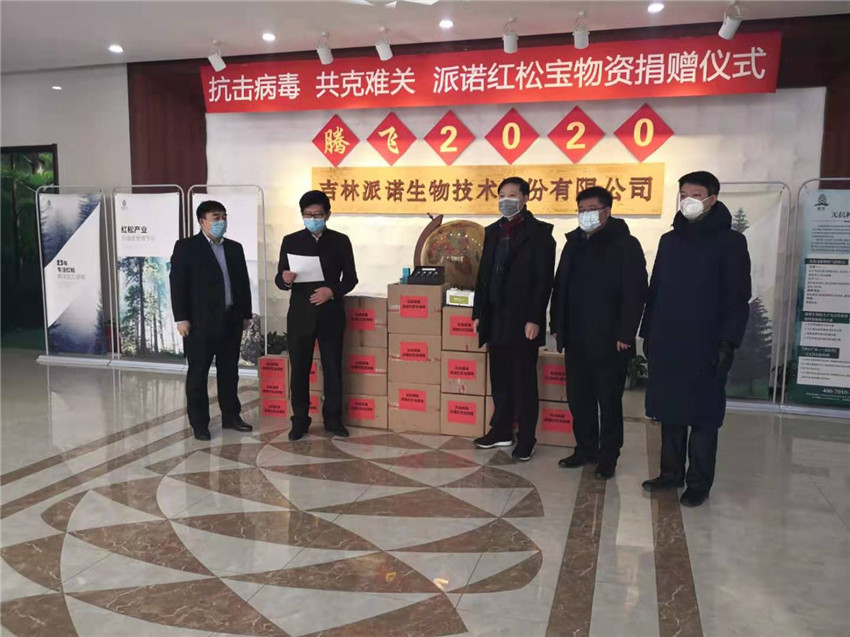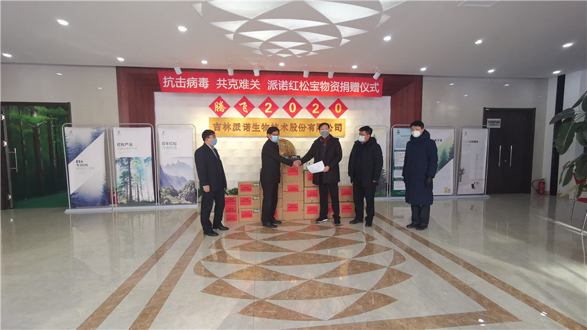 2020年2月2日长春新区北湖开发区党委书记于柏生一行人来到公司总部,领取了公司向社会捐赠的物资——价值二十万元的红松精油消杀系列产品,详单如下:红松植物精油500瓶、红松基多酚手喷空气净化器60套、松林迷雾空气清新喷雾剂30瓶等。红松精油消杀系列产品主要成分为红松多酚精油,经韩国相关专家、科研机构证实,红松精油对冠状病毒拥有很好的消杀功效,能够起到很好的预防作用。